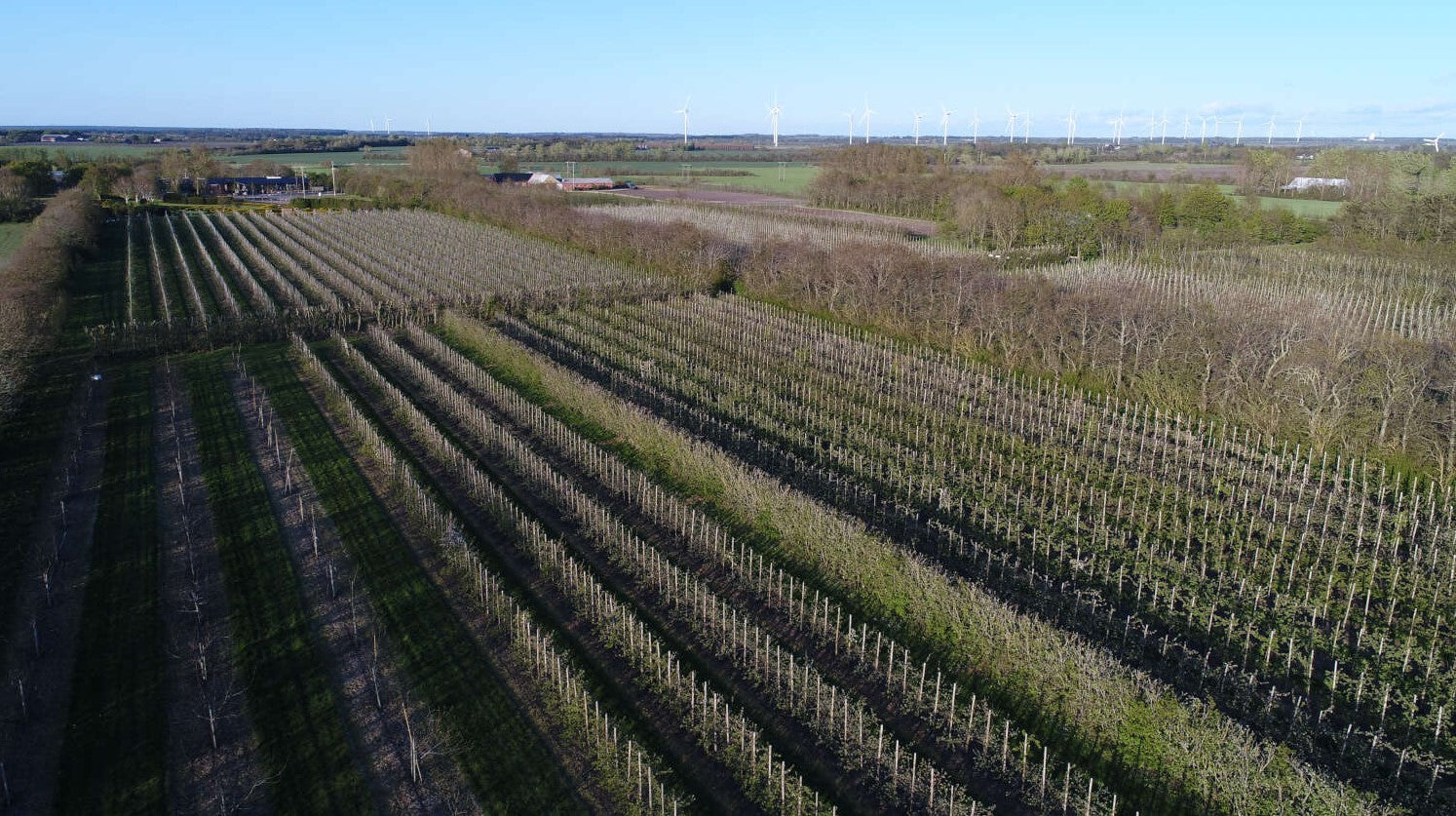 En flygvy över hela fruktträdgården från tidig vår. Här väntar vi med spänning på årets skörd. I bakgrunden finns en av Danmarks största vindkraftsparker belägen i Hjortmose. Vi använder förnybara energikällor i vår produktion.
